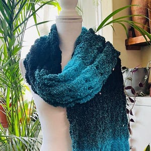 Fashionable stylish big long shawl turquoise-black colors neck shoulders wrap chunky hand loose knit fringed shawl/Gift for Her