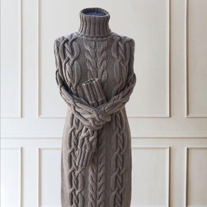 100% Merino Wool Cable Knit Turtleneck Sweater Dress – Handmade Knitted Sweater Dress