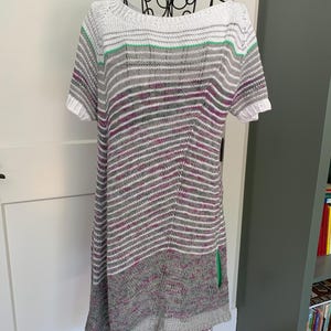 Hand Knit Cotton Sweater Tunic or Dress – Short sleeves – A-line Swing shape – One of a Kind – Ladies L – gray white stripes
